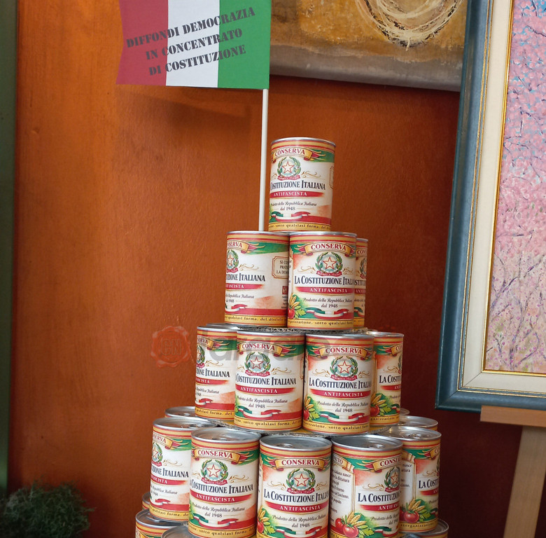 In vetrina è esposta una torre di lattine sormontata dal tricolore italiano con lo slogan “diffondi democrazia in concentrato di Costituzione”, a sintetizzare il senso del progetto: trasformare un oggetto quotidiano in un veicolo di riflessione sui valori fondanti della Repubblica.