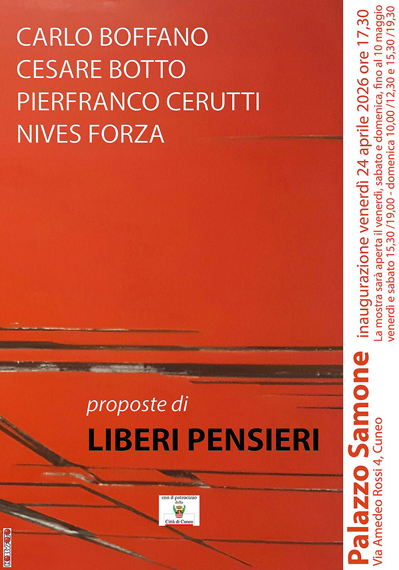 A Palazzo Samone, dal 24 aprile al 10 maggio 2026, si terrà la mostra collettiva “Proposte di LIBERI PENSIERI”, patrocinata dal Comune di Cuneo e inaugurata venerdì 24 aprile alle ore 17.30. L’ingresso è libero, con apertura il venerdì e il sabato dalle 15.30 alle 19.00 e la domenica dalle 10.00 alle 12.30 e dalle 15.30 alle 19.30.