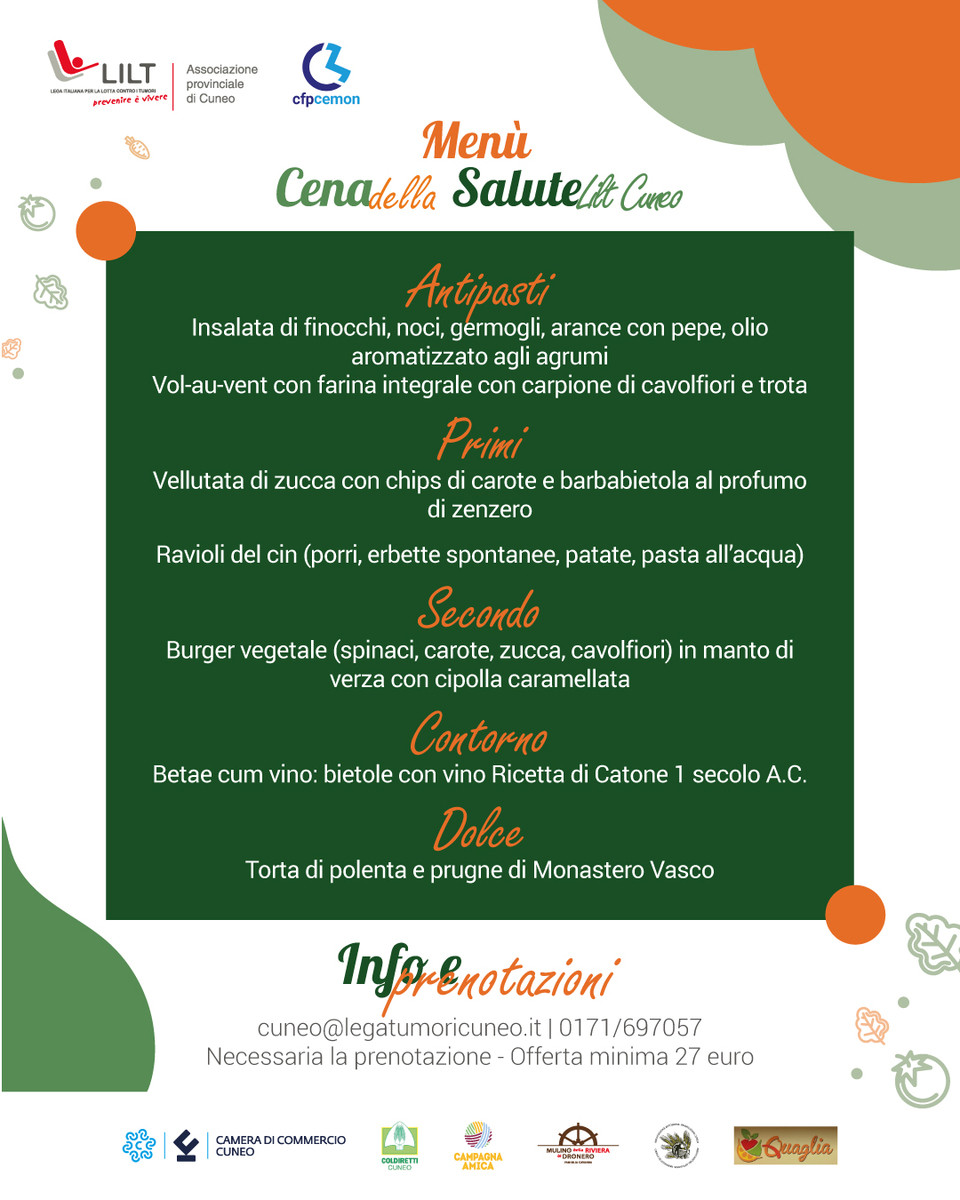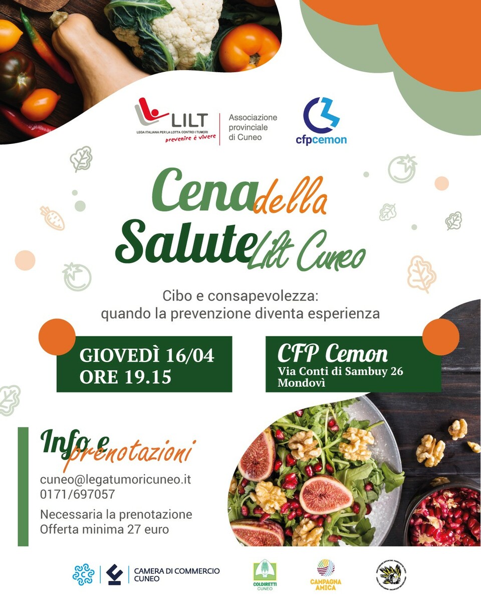 La LILT Associazione provinciale di Cuneo, in collaborazione con il CFP Cemon, promuove per giovedì 16 aprile alle ore 19.15 la “Cena della Salute LILT Cuneo”, in programma presso il CTP Cemon, in via Conti di Sambuy 26 a Mondovì.