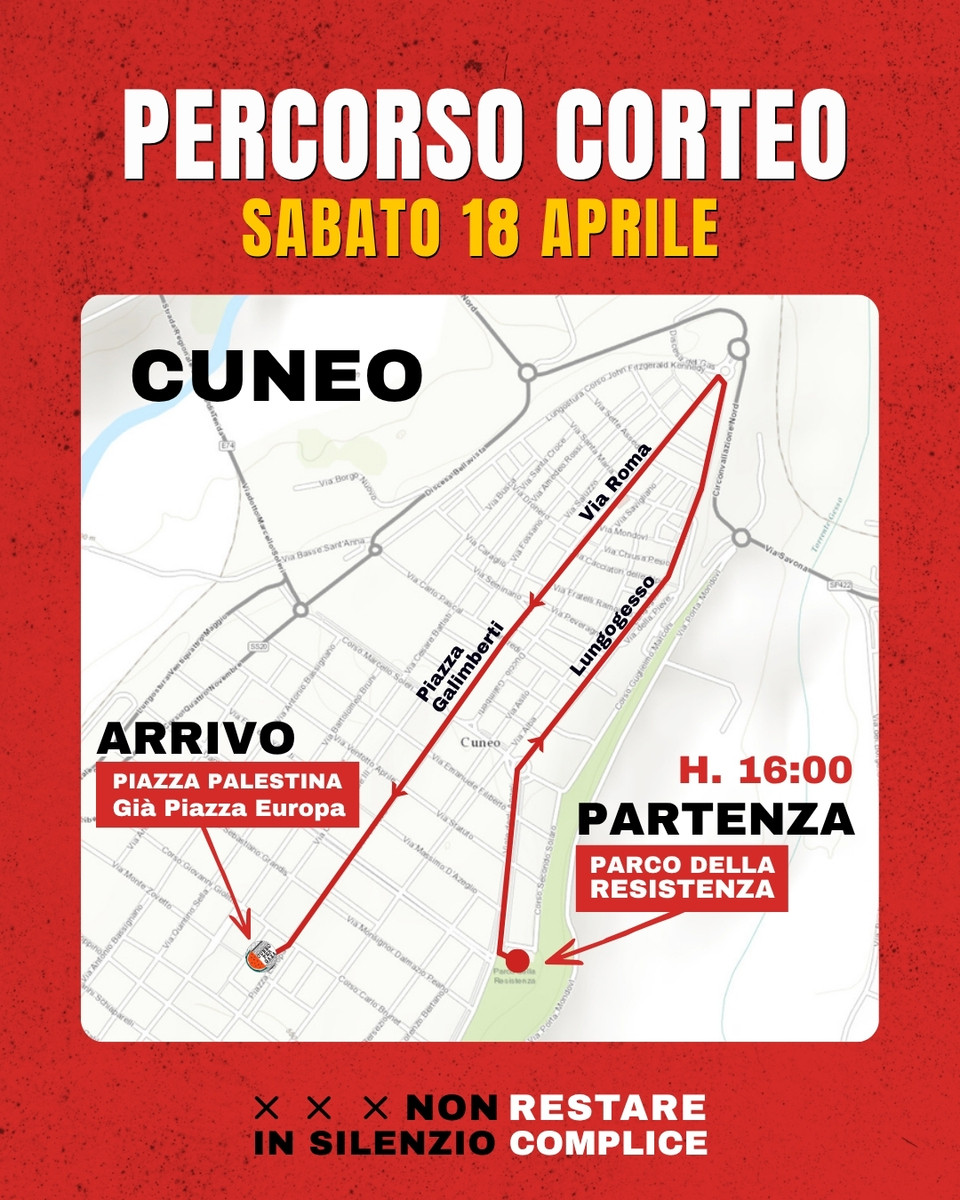 Sabato 18 aprile, con partenza alle ore 16 dal Parco della Resistenza di Cuneo, la provincia Granda torna a mobilitarsi per denunciare la spirale di guerra e devastazione innescata da Israele e Stati Uniti in tutta l’Asia occidentale e nei paesi del Golfo.