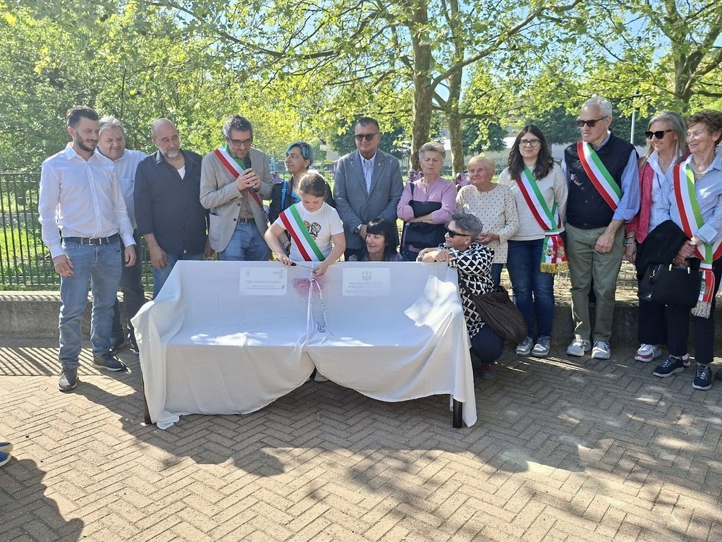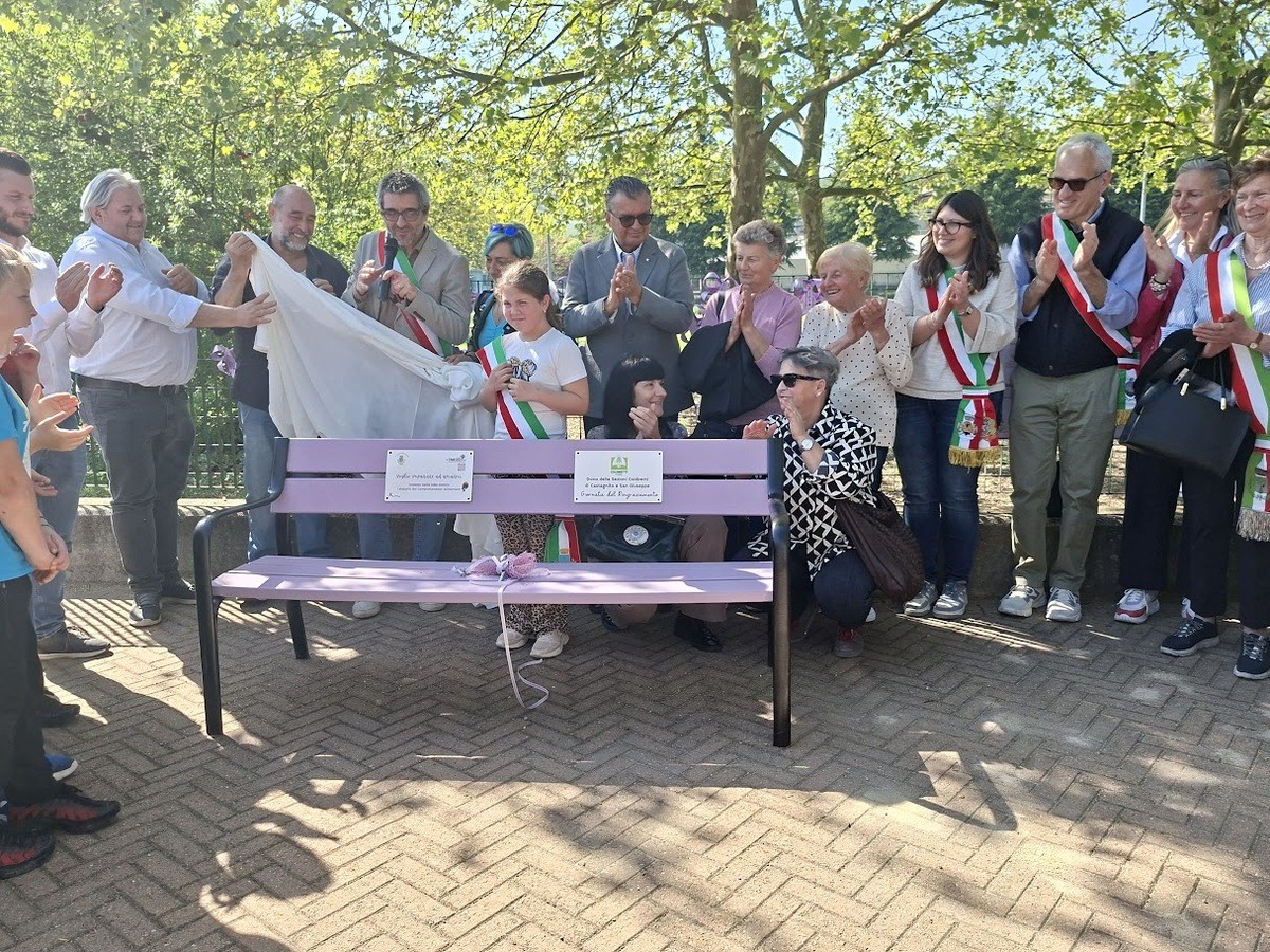 Inaugurazione ieri, giovedì 16 aprile, della quinta “Panchina lilla” del Roero, presso il piazzale della scuola primaria “Suor Tecla Merlo” di Castagnito.