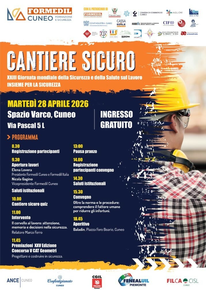 Martedì 28 aprile si celebrerà a Cuneo, in occasione della XXIII “Giornata Mondiale della Sicurezza e della Salute sul Lavoro”, un importante evento organizzato da Formedil Cuneo, presso lo Spazio Varco di via Pascal 5L.