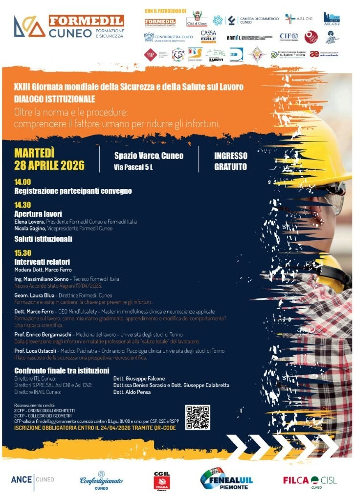 Si svolgerà martedì 28 aprile a Cuneo, in occasione della XXIII 'Giornata Mondiale della Sicurezza e della Salute sul Lavoro', un articolato evento organizzato da Formedil Cuneo, presso lo Spazio Varco di via Pascal 5L.