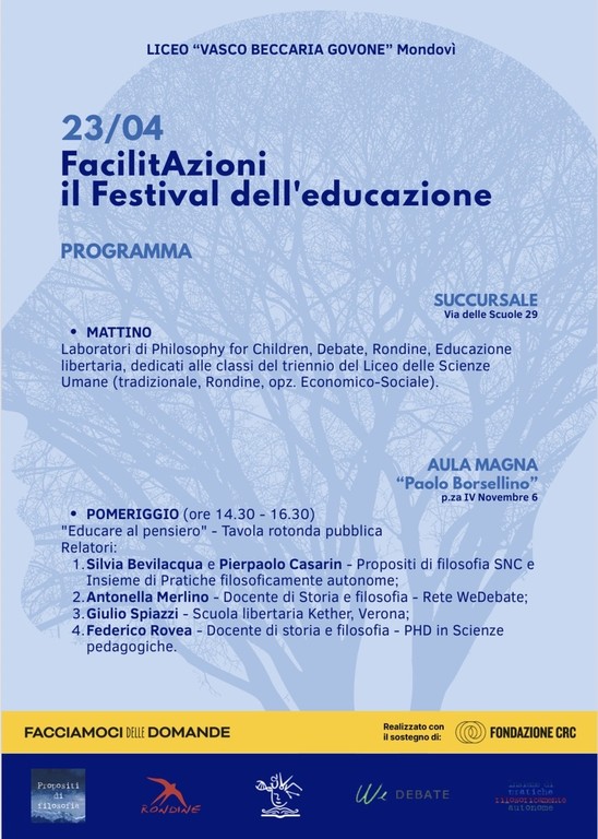 Il Liceo Vasco-Beccaria-Govone di Mondovì promuove per giovedì 23 aprile “FacilitAzioni – il Festival dell’educazione”, giornata interamente dedicata alla riflessione e alla pratica educativa. L’iniziativa si propone come spazio di confronto dinamico, in cui sperimentare approcci innovativi all’apprendimento e al pensiero critico.