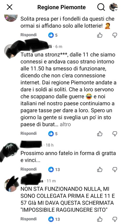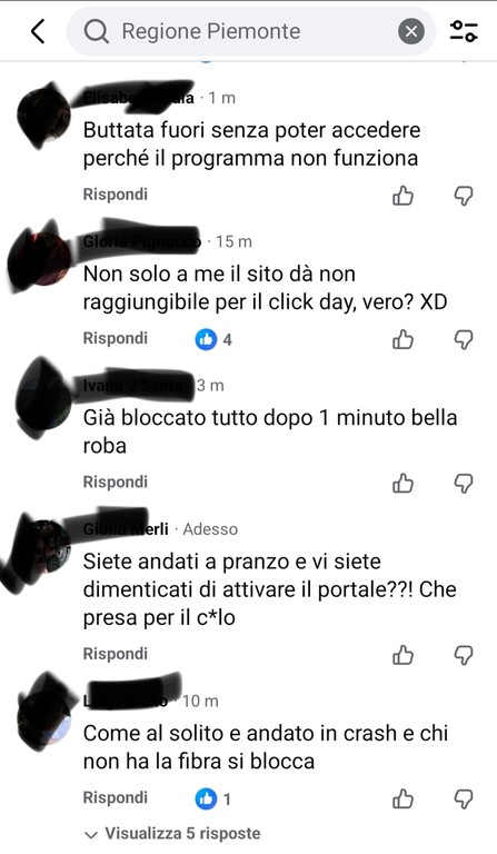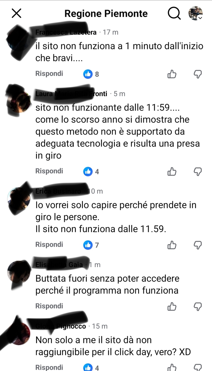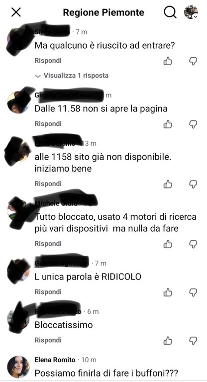 E mentre il sito è bloccato, sono decine i commenti di genitori infuriati apparsi sulla pagina facebook della Regione Piemonte, sotto il post dedicato a Vesta. La maggioranza scrive "Il sito non funziona dalle 11.59" oppure "dalle 11.58 non si apre la pagina". Un altro utente aggiunge "Tutto bloccato, usato 4 motori di ricerca più vari dispositivi ma nulla da fare". C'è poi chi attacca: "Siete andati a pranzo e vi siete dimenticati di attivare il portale?"