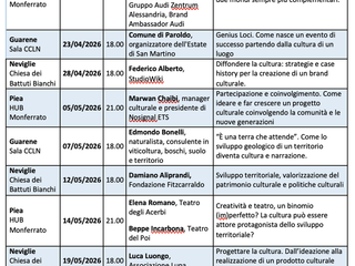 Tutti gli incontri sono a ingresso libero e si svolgono il martedì e il giovedì in alcuni luoghi simbolici del progetto: a Guarene e a Piea presso gli hub riqualificati grazie a Snodi, mentre a Neviglie gli appuntamenti hanno luogo presso la Chiesa dei Battuti Bianchi.