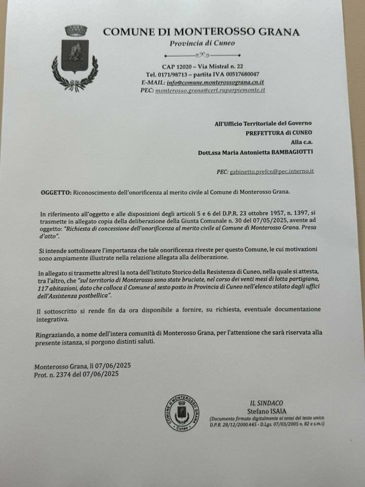 "Monterosso ha dato moltissimo alla Resistenza. Quando è venuto Mattarella, due anni fa, nel suo discorso al teatro Toselli non aveva citato il nostro paese tra quelli che più avevano pagato in termini di vite e distruzione. Ho pensato che non fosse giusto, così ho coinvolto due storici, che hanno fatto ricerche e preparato un dossier ricco di documenti e testimonianze. Lo abbiamo dato al Prefetto e tramite lui abbiamo avanzato la richiesta di riconoscimento dell'Onorificenza al Merito civile al Comune di Monterosso Grana. Io non ho mai negato e mai negherò il valore della Resistenza. Ho pensato che non fosse il caso di cantare quella canzone dopo l'episodio accaduto il giorno prima".