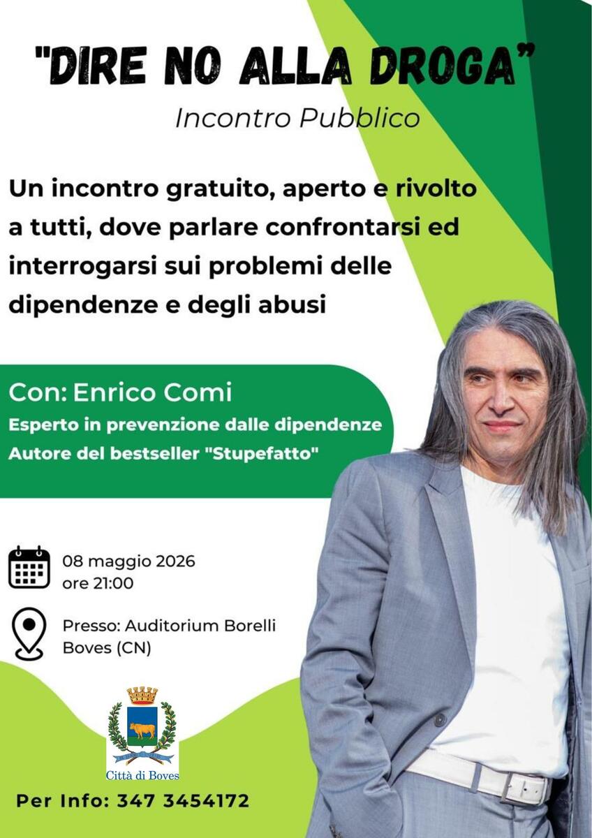 Venerdì 8 maggio 2026 alle ore 21:00 presso l’accogliente auditorium Borelli di Boves si terrà l’incontro “dire no alla droga”.