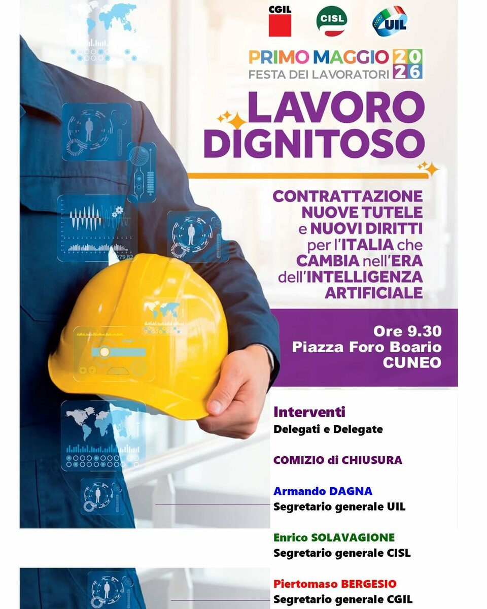 “Lavoro Dignitoso": questo il tema del primo Maggio 2026. Come ogni anno Cgil, Cisl, Uil celebrano la festa dei lavoratori con un ricco programma di manifestazioni a Cuneo e in tutto Piemonte. Al centro del dibattito ci sarà la “Contrattazione, le nuove tutele e i nuovi diritti per l’Italia che cambia nell’era dell’Intelligenza Artificiale".