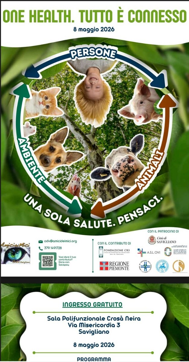 La salute dell’uomo, quella degli animali e la tutela dell’ambiente non sono compartimenti stagni, ma elementi di un unico sistema interconnesso. È questo il cuore del concetto di “One Health”, che sarà protagonista del convegno dal titolo “One Health. Tutto è connesso”, previsto per venerdì 8 maggio 2026 presso la Sala Polifunzionale Crosà Neira (Via Misericordia 3, Savigliano).