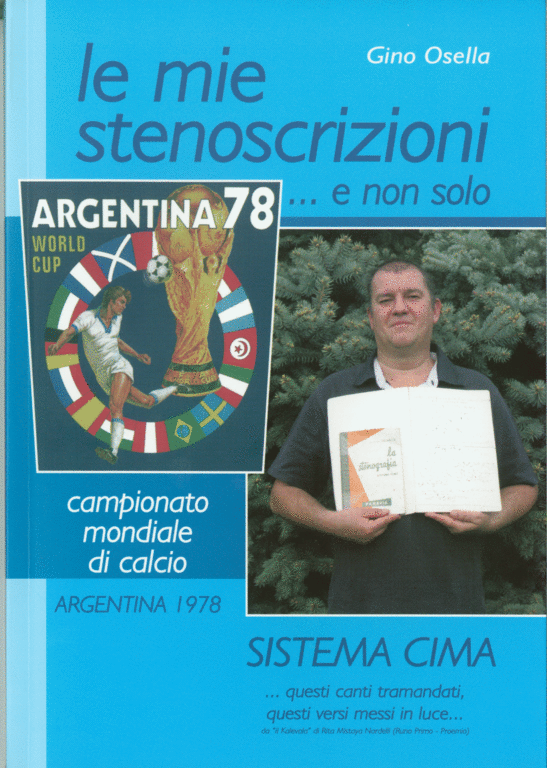 Il titolo, o meglio i titoli: "LE MIE STENOSCRIZIONI ... E NON SOLO - ARGENTINA 78 - CAMPIONATO MONDIALE DI CALCIO - SISTEMA CIMA ... questi canti tramandati, questi versi messi in luce ...", ginopio editore coi tipi della T.M.C. di Caramagna Piemonte.Tra i sicuri lettori il sindaco dei Caramagna Piemonte, che non ha perso tempo a ringraziare l’autore: “Grazie Gino, per questo ennesimo lavoro, che piace senz'altro ai nostalgici della stenografia come me e quanti hanno avuto la ventura e la fortuna di studiare questi "geroglifici" che incuriosivano i profani, che per tanti sono stati occasione di una professione riconosciuta e per i più bravi anche di sfide, gare e concorsi internazionali. Piacerà penso anche agli altri, che potranno soddisfare un po' di curiosità su questa misteriosa scrittura”.