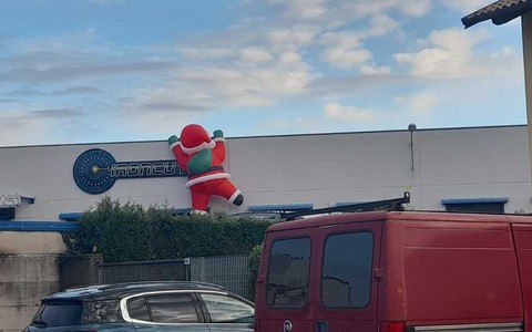 Un maxi Babbo Natale “acrobata” fa gli auguri da Ironcut di Manta